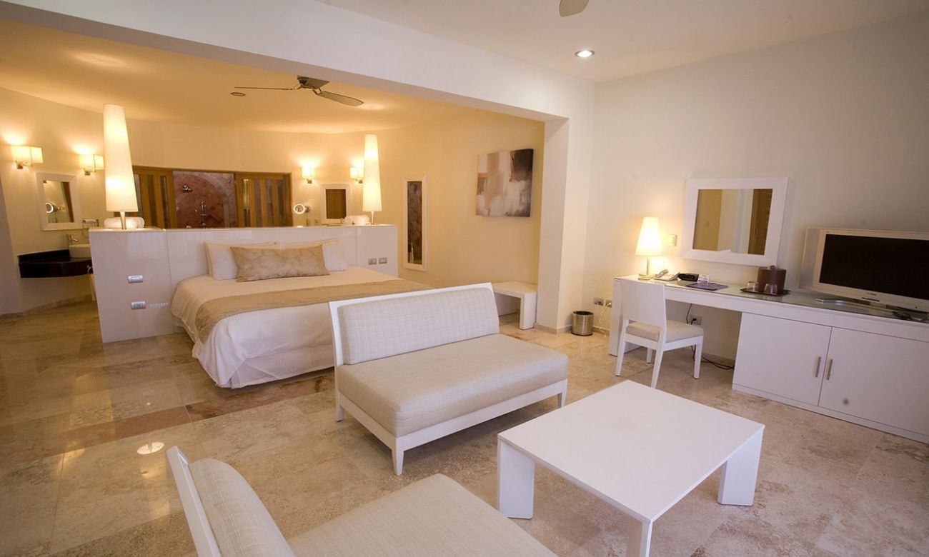 134 Deluxe Junior Swimout (13+) - 55 кв.м., разположен на партерния етаж, директен достъп до басейна от терасата, спалня, кът за сядане с диван, баня с джакузи, тераса с шезлонги, макс. 3 души.