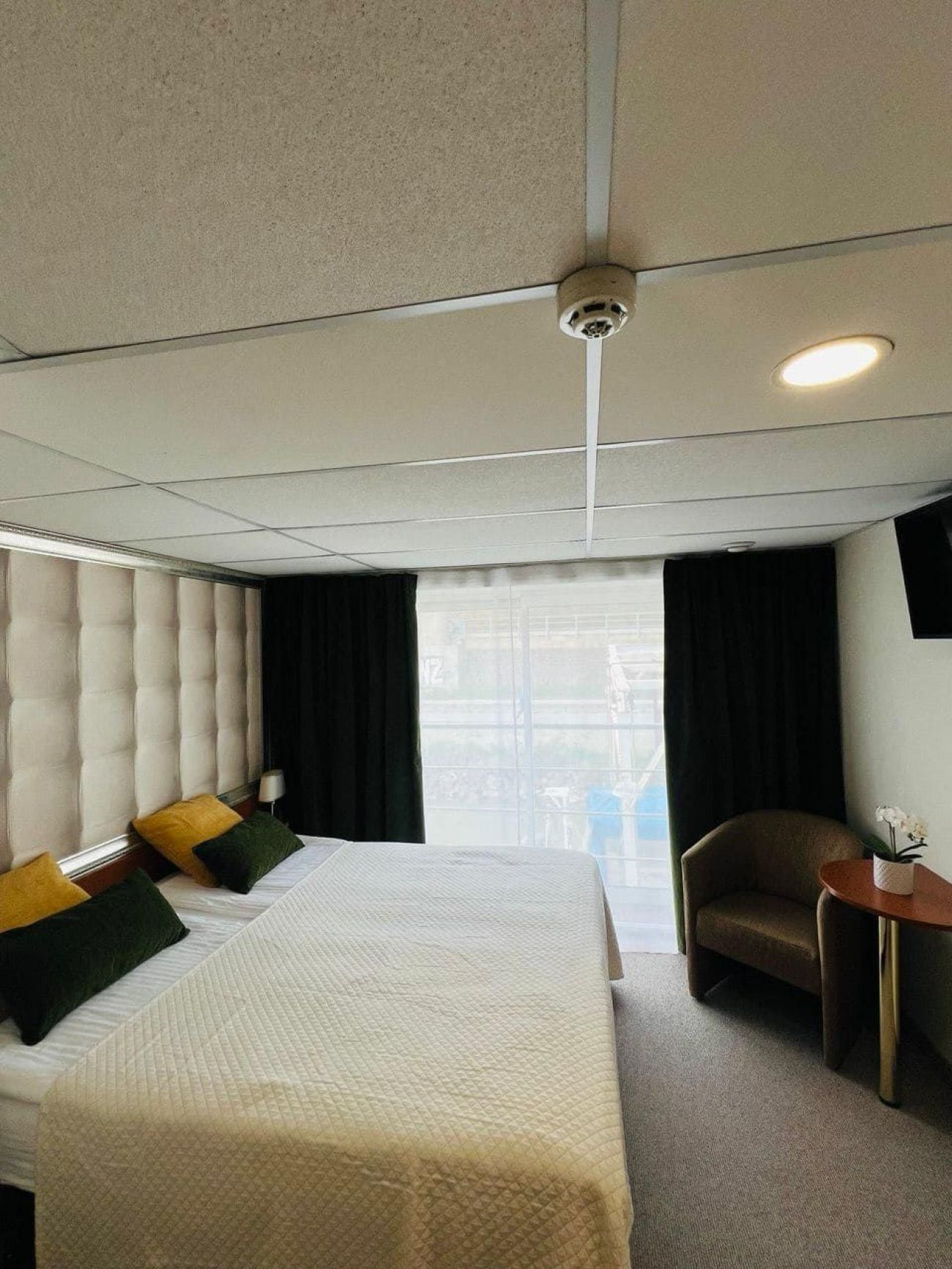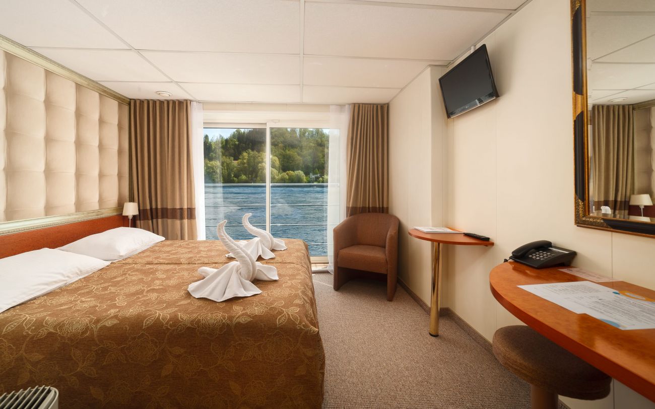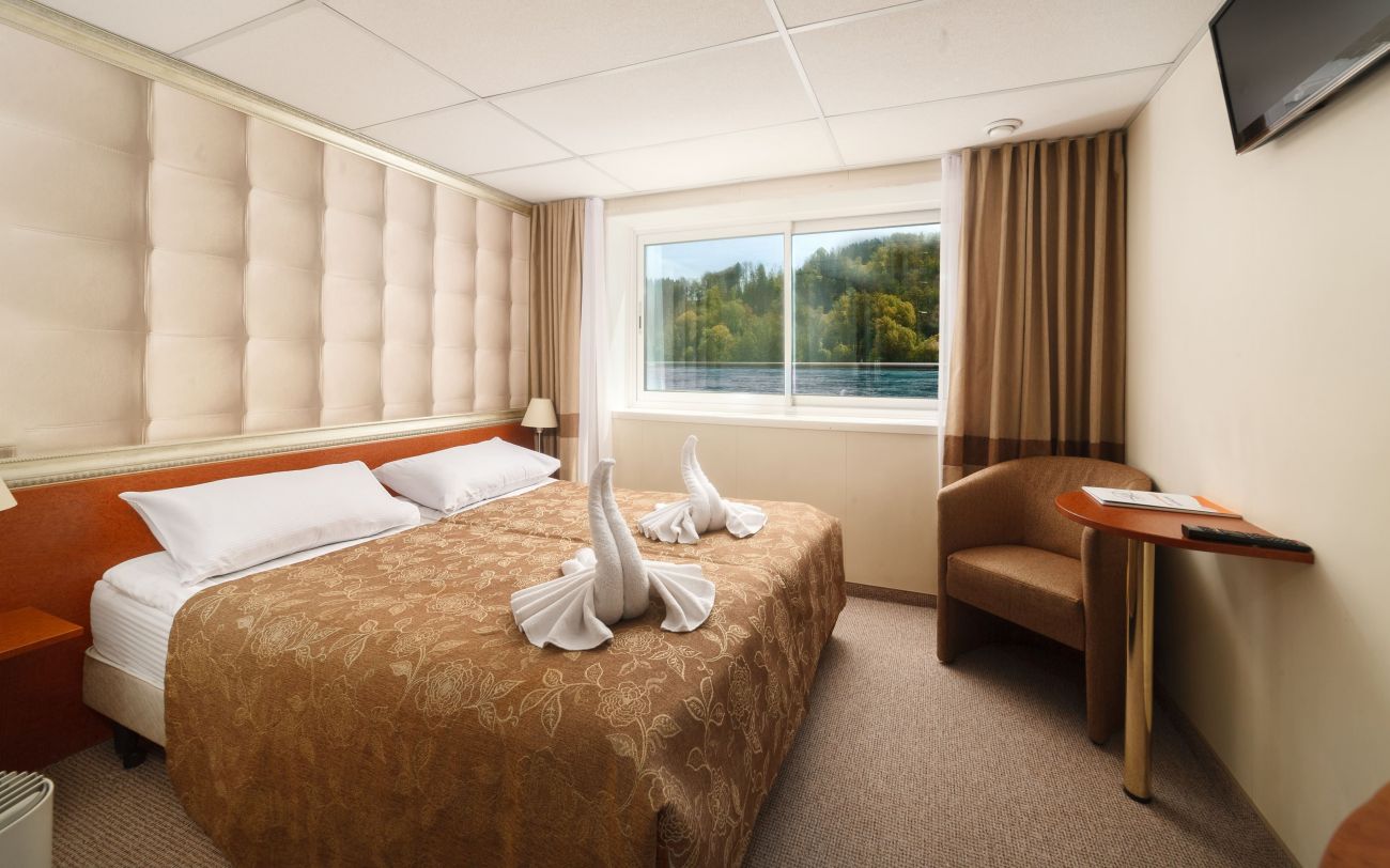 . Каютите са разположени на 3 палуби, като на основна палуба разполагат с илюминатори, които не се отварят, на средна с прозорци и на горна с големи френски прозорци, които се отварят. Всички каюти имат индивидуален климатик, сателитна ТВ, сешоар, баня и тоалетна.