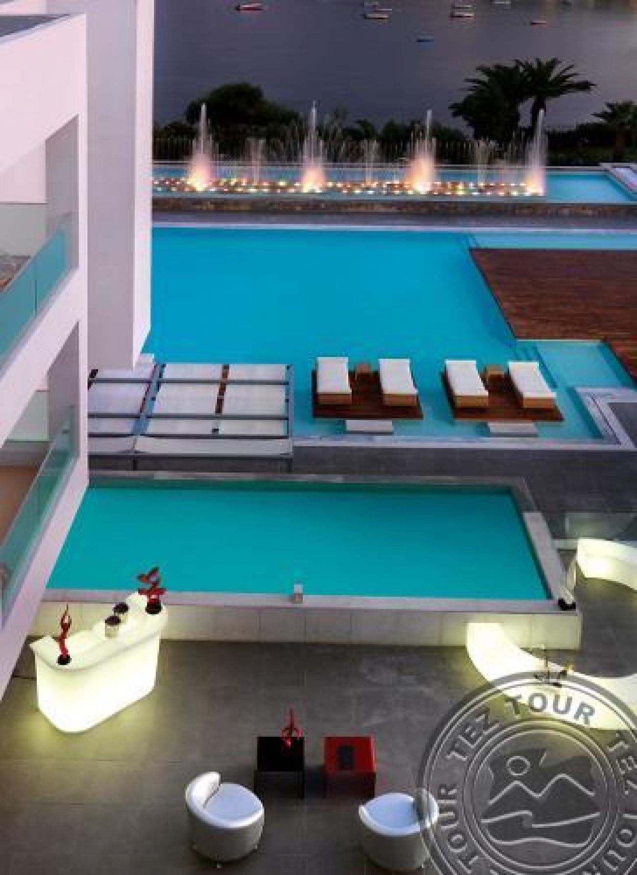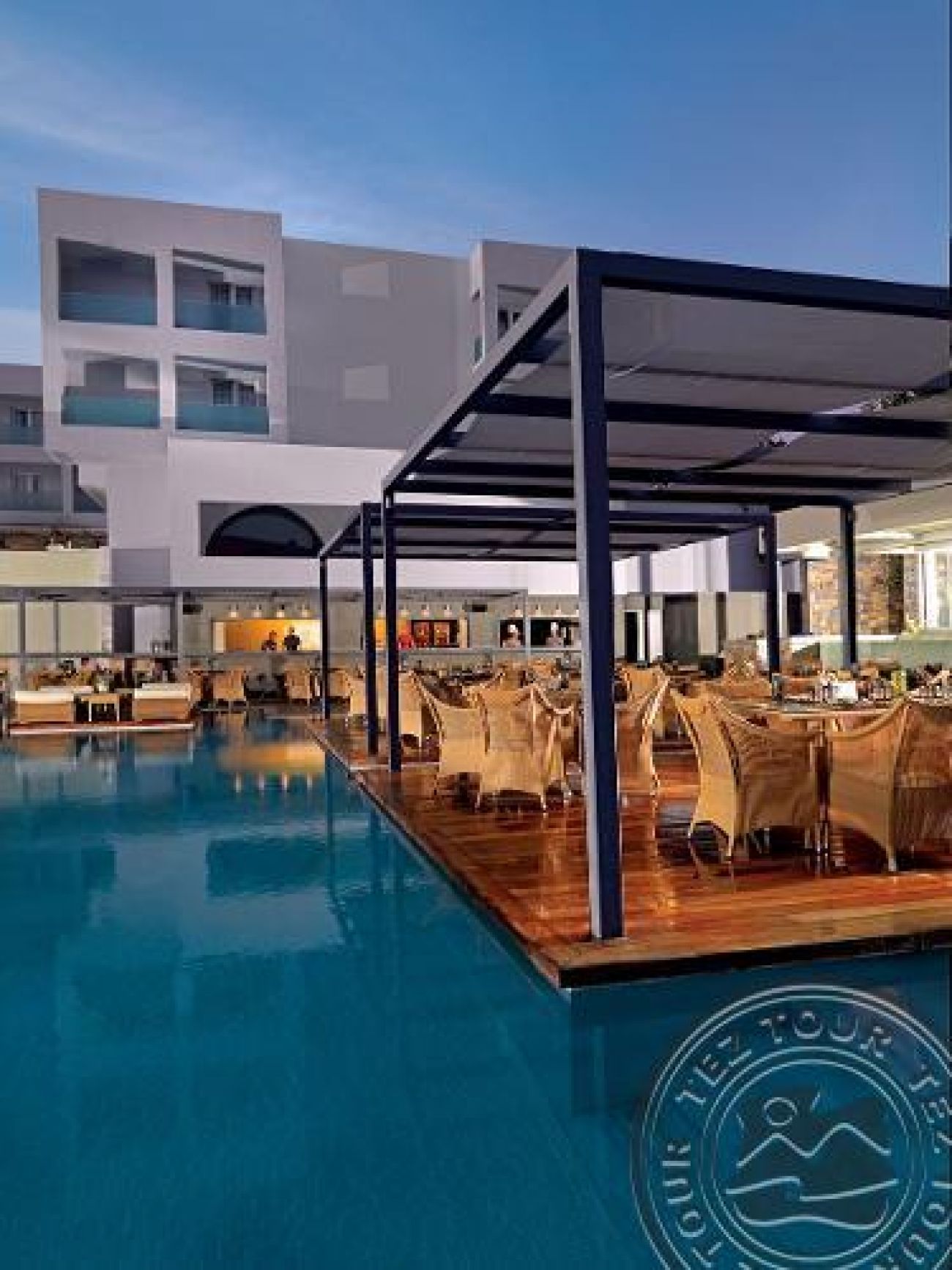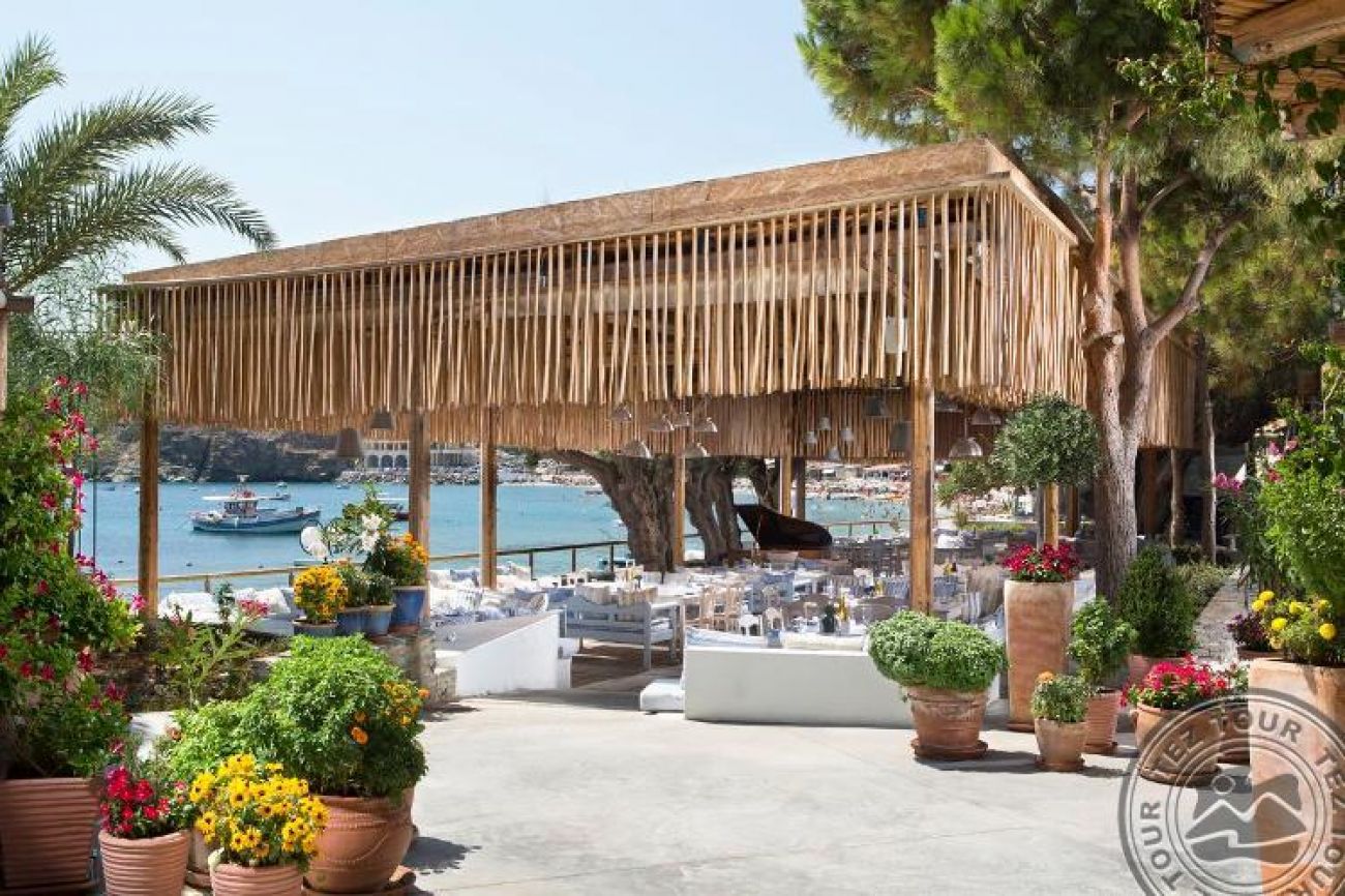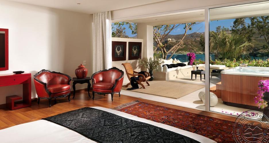 Хотелът е построен на частен полуостров с невероятна гледка към Егейско море. Представлява луксозен хотелски комплекс на брега на морето с уникален уелнес център. Хотелът е визуално разделен на две части: OUT OF THE BLUE, BEACH RESORT и OUT OF THE BLUE, LIFESTYLE & EXCLUSIVE COLLECTION. Предлага широка гама от апартаменти, мезонети и вили със собствен басейн и отлични съоръжения за отдих. Районът е заобиколен от буйна растителност и невероятна ботаническа градина. Отглежда собствени органични плодове, зеленчуци и билки, които покриват голяма част от нуждите на хотела. Предлага на своите гости изключителна почивка в уединена и луксозна обстановка. Препоръчваме за всяка категория туристи. По време на вечеря в хотела важи задължителен дрескод.