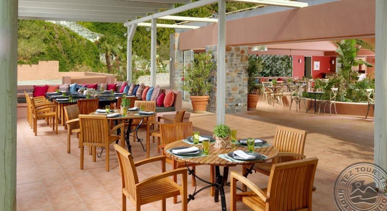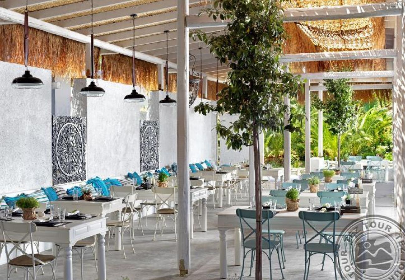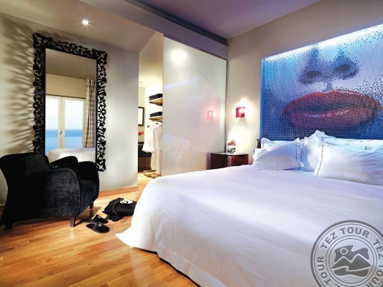 Хотелът е построен на частен полуостров с невероятна гледка към Егейско море. Представлява луксозен хотелски комплекс на брега на морето с уникален уелнес център. Хотелът е визуално разделен на две части: OUT OF THE BLUE, BEACH RESORT и OUT OF THE BLUE, LIFESTYLE & EXCLUSIVE COLLECTION. Предлага широка гама от апартаменти, мезонети и вили със собствен басейн и отлични съоръжения за отдих. Районът е заобиколен от буйна растителност и невероятна ботаническа градина. Отглежда собствени органични плодове, зеленчуци и билки, които покриват голяма част от нуждите на хотела. Предлага на своите гости изключителна почивка в уединена и луксозна обстановка. Препоръчваме за всяка категория туристи. По време на вечеря в хотела важи задължителен дрескод.