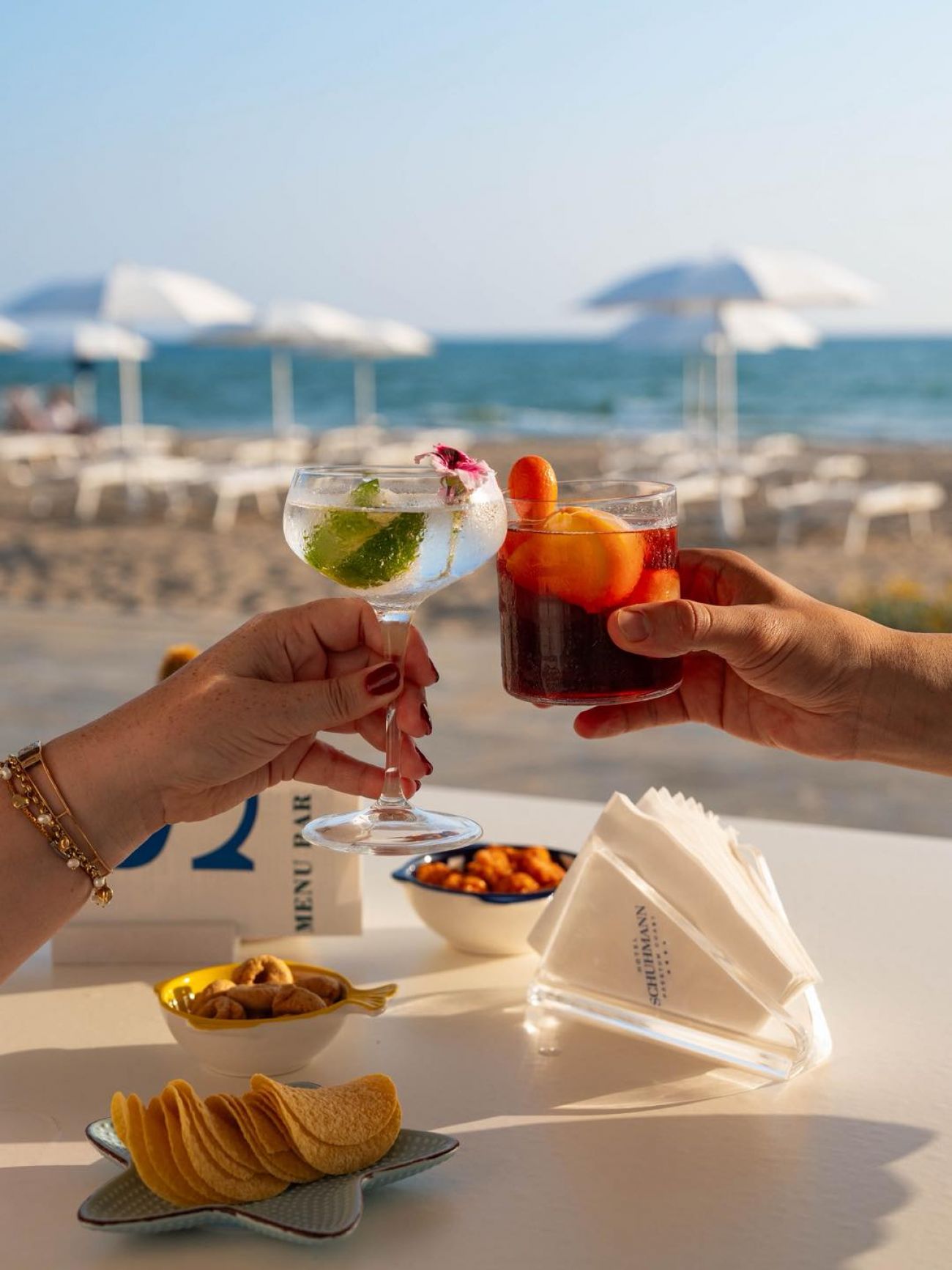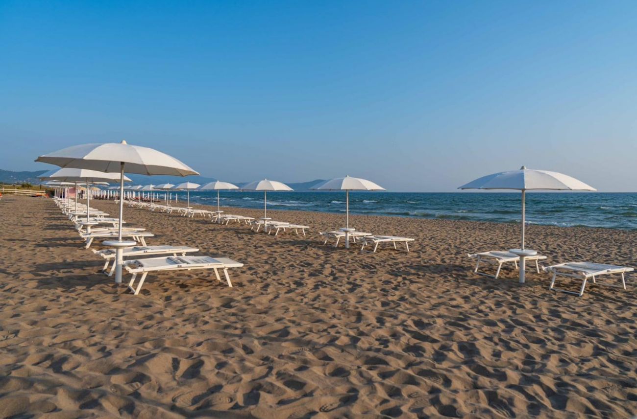 Собствен, пясъчен.Чадъри и шезлонги на плажа се предоставят в периода от юни до септември. На първи и втори ред шезлонги и чадъри са срещу заплащане и изискват предварителна резервация, след трети ред са безплатни.