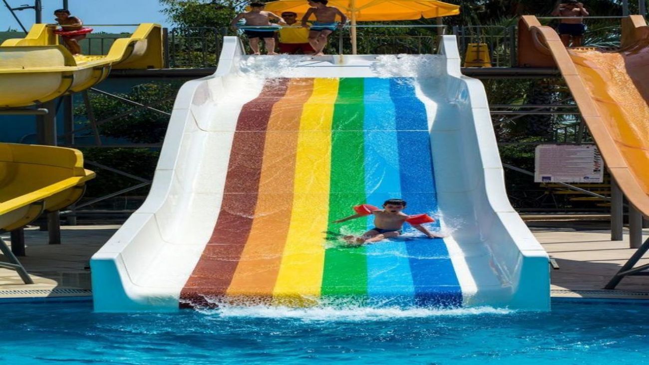 Има три външни басейна, два детски басейна и един вътрешен с три пързалки.
