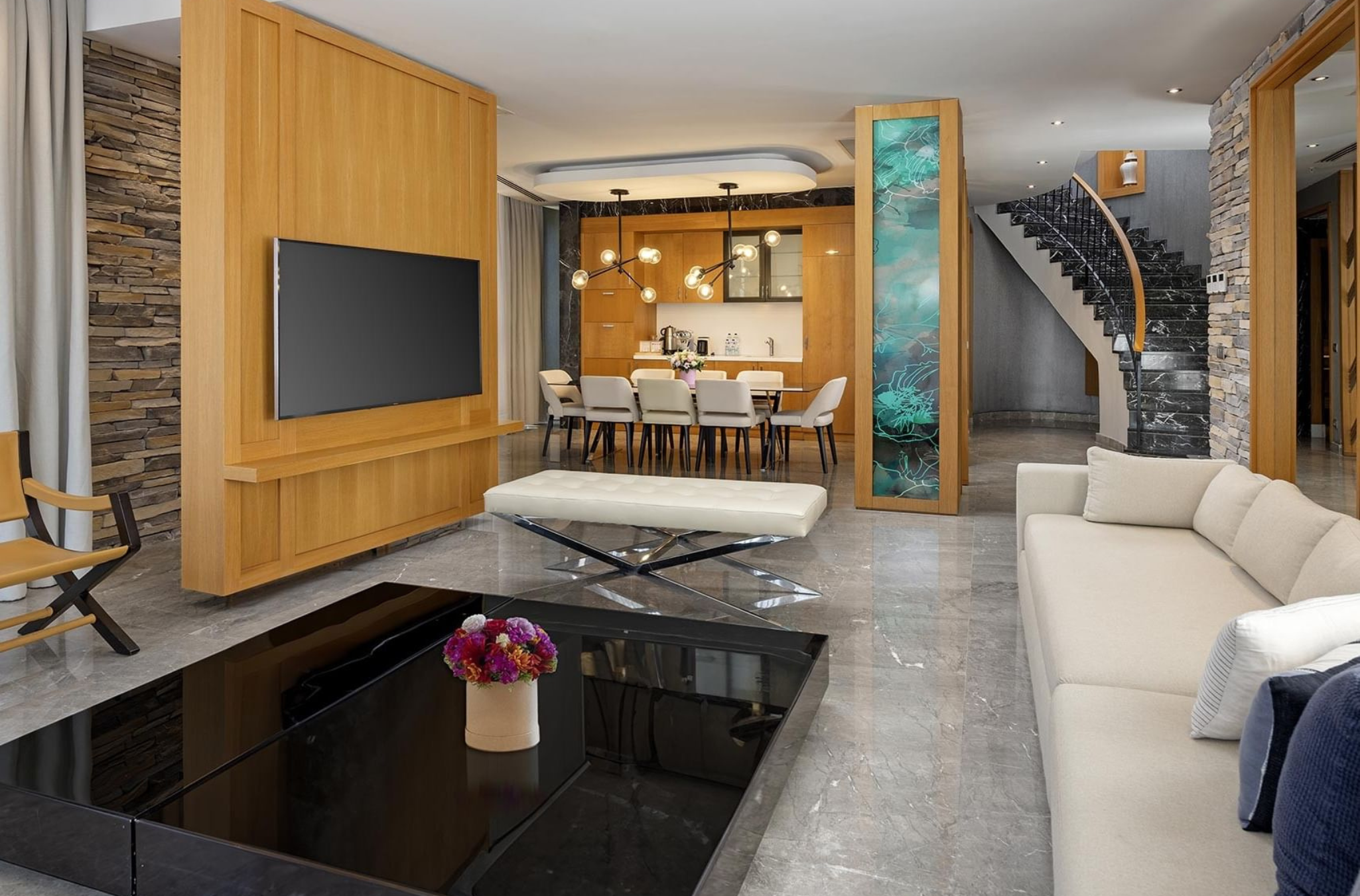 Вили: Exclusive Villa (1-ви етаж: всекидневна, спалня и баня; 2-ри етаж: две спални и две бани, 1 тераса и собствен басейн; всички спални имат балкон, по-богато разнообразие в мини бара, иконом), Superior Villa (1-етаж: кухня, всекидневна, сауна и баня; 2-ри етаж: 4 спални, тераси и собствен басейн, джакузи, маса за вечеря, богато разнообразие в мини бара, иконом – 300 м²), Presidental Villa (3-етажна вила, разположена в градините на хотела, кухня, всекидневна, хамам, сауна на първия етаж, 6 спални, турска баня, собствен басейн, сауна, асансьор, иконом – 530 м²).
