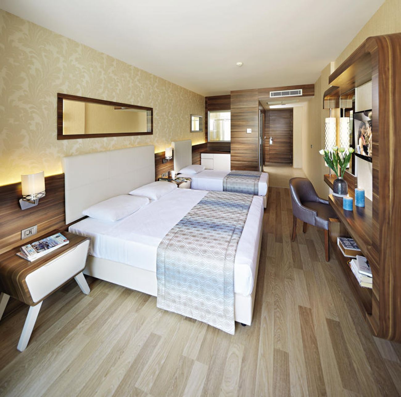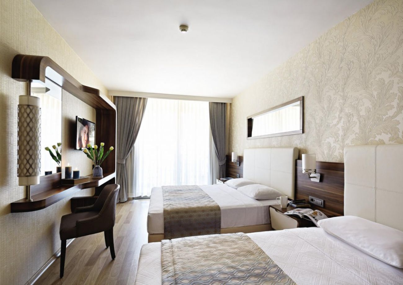 Хотелът разполага общо с 170 стаи, от които Standart rooms (24 m2), Suite Rooms (32 m2), Superior rooms. Всички стаи са оборудвани с климатик, телевизор, телефон, баня с душ, сешоар, мини бар, сейф (платен), балкон. Почистване на стаите – всеки ден, смяна на спалното бельо и кърпите – 2 пъти в седмицата.