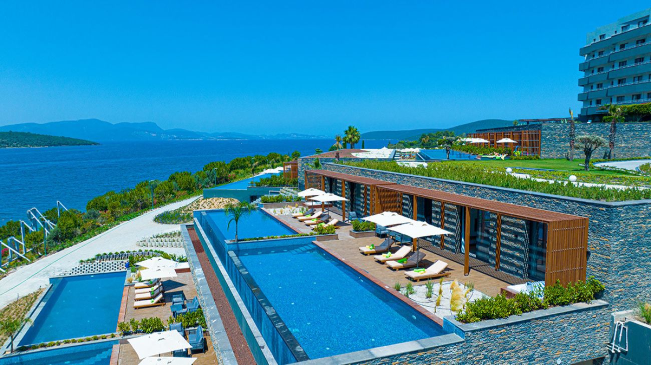 La Blanche Island се намира в уединен и много красив район на крайбрежието на Гюверджинлик с обща площ от 82 000 m². Включва собствена пясъчна ивица от общо 1200 м, и aква парк. Летище Милас Бодрум е на 15 км. Пред хотела има спирка за градски транспорт. Реновация през 2023/4 г на ресторантите, общите части и подобрена Ultra All Inclusive концепция.