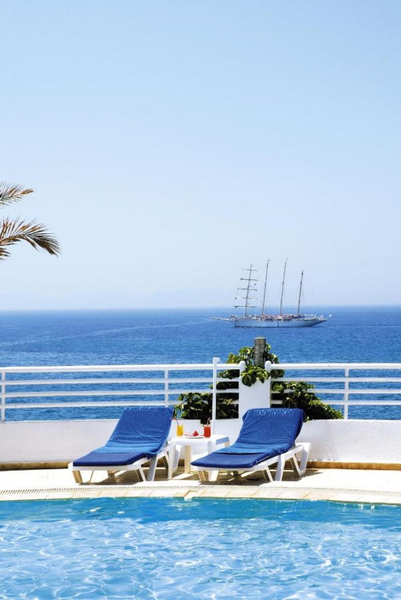 Собствен, пясъчно-чакълест и платформа в малък живописен залив. Достъпът до плажа е по стълби / с асансьор. Чадъри, шезлонги, матраци и кърпи – безплатно.