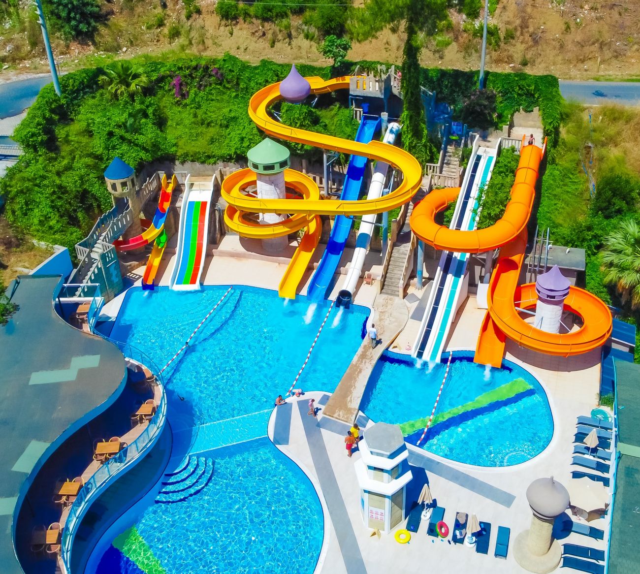 Оновен ресторант, 2 а-ла-карт ресторанта (с предварителна резервация), 6 бара, дискотека, 2 открити басейна, водни пързалки, аквапарк, амфитеатър, магазини, СПА център, конферентна зала, паркинг. За децата: детско меню, детски басейн, водни пързалки, детска площадка, бейби клуб (1- 3 г.), мини клуб (4–12 г.), джуниър клуб, детска количка. Безплатни услуги: СПА център, сауна, турска баня, фитнес, аеробика, мини футбол, тенис на маса, анимационна програма,WI-FI интернет в лоби. Платени услуги: Масаж, пилинг, фризьор, магазини, химическо чистене, лекар, билярд, кану, моторни водни спортове.