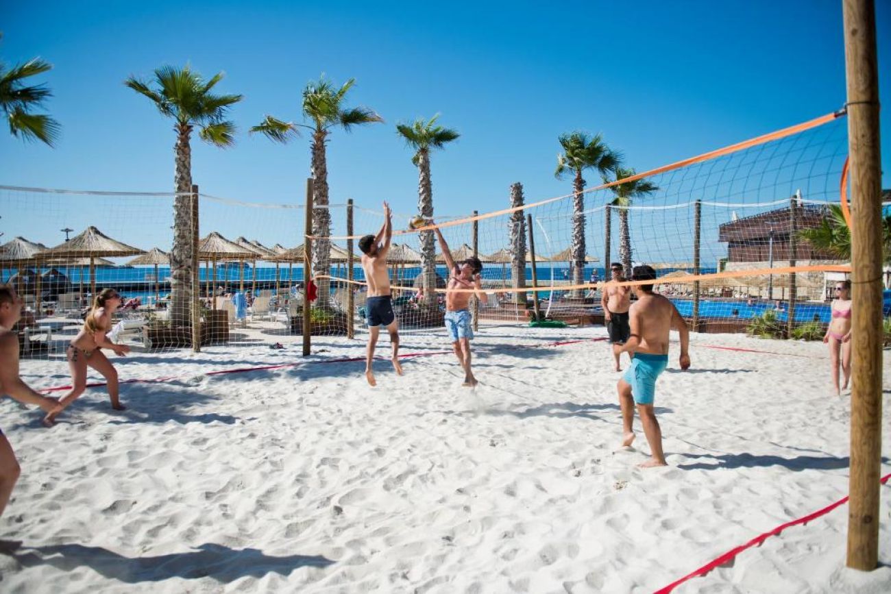 Собствен, пясъчен, платформа– чадъри и шезлонги на плажа и при басейна – безплатно, плажни кърпи - срещу депозит. Плажа е носител на сертификат за "Син флаг"