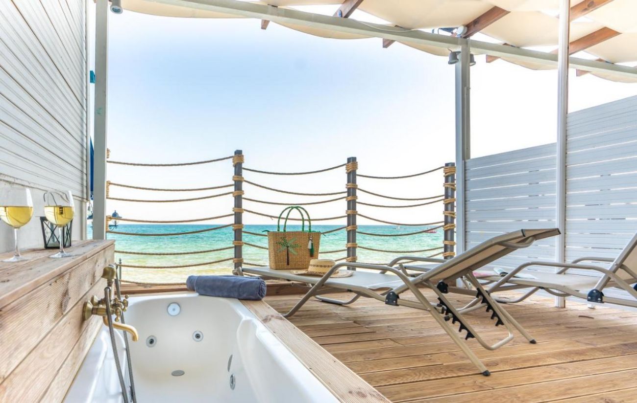 Двойна стая seafront - Построени са точно пред морето с неблокиран изглед към залива Термаикос. Разполагат с голям балкон с градински мебели и собствено джакузи за уникални моменти на релакс до морето. Разполагат с 2 единични легла. (25 m 2 )
